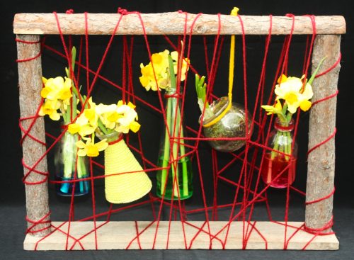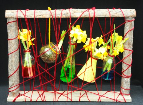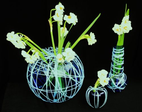 Een muur van drie blauwe vazen met lichtblauwe draad verwijst naar de blauwe muur van het zeewater. In de drie blauwe vazen bloeien volop Paasbloemen of Narcissen, geel als de zon. De zon staat symbool voor God.