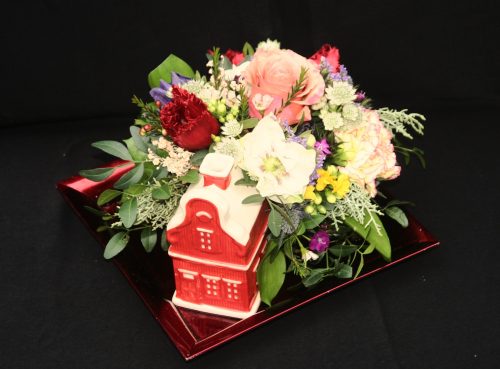 Bij de achterdeur van het roodwitte huisje komt ‘bloemenvreugde’ naar binnen: een zalmkleurige geurende roos als teken van liefde, drie geelrode anjers als Bloemen van God, rode tulpen in de kleur van de liefde, Gypskruid staat voor eeuwige liefde, gele Kalanchoë ook. Van de wortelstok van de Astrantia maakt men in de volksgeneeskunde maagversterkende stoffen. Helleborus is de bloem van de hoop. Felroze Duizendschoon is familie van de anjer en daarom een Bloem van God. Paarse Anemoon symboliseert hoop, blauwe Distel (honger) lijden. En Waxflower staat voor liefde en vreugde.