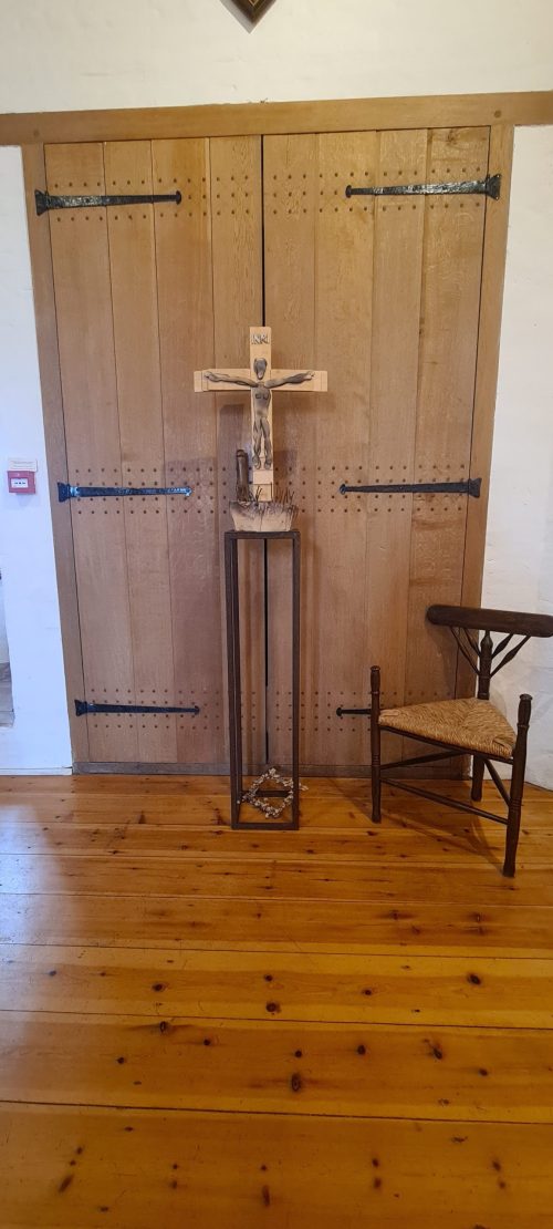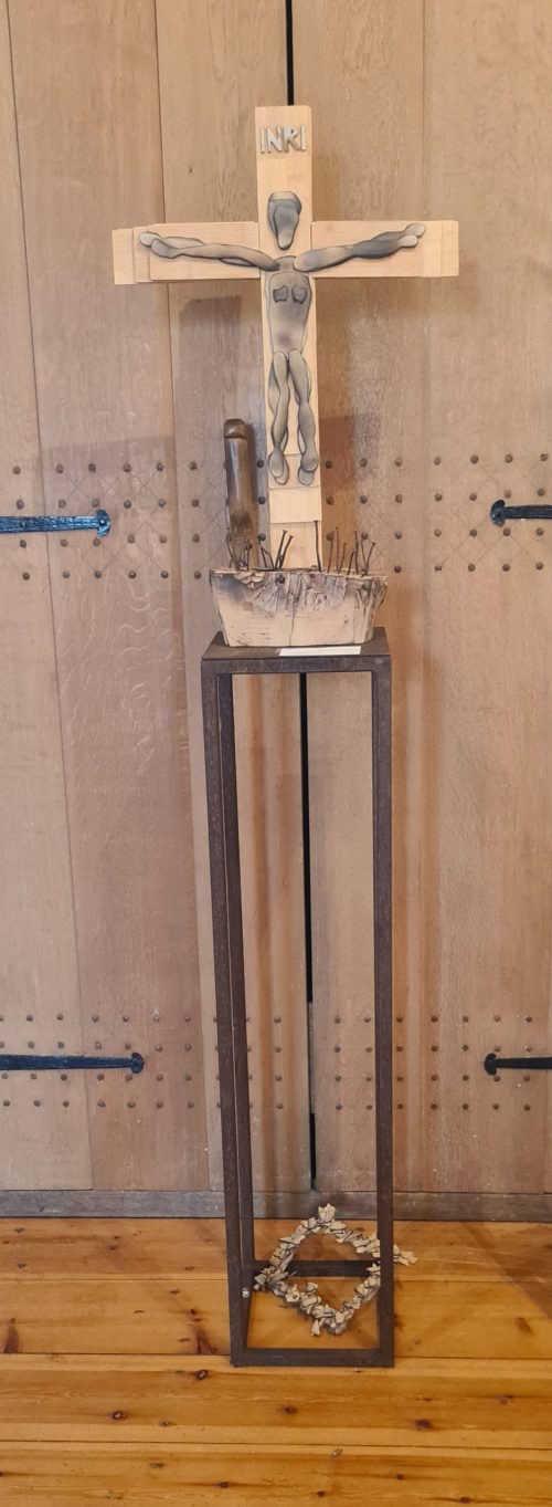Ik heb de bakken uit elkaar gehaald en getransformeerd tot een crucifix en doornenkroon. De crucifix is teruggeplaatst van toen naar nu en staat op een sokkel voor de altaardeuren. Al het hout is gebruikt voor kruis, figuur van Jezus en van de restanten is de doornenkroon gemaakt.”