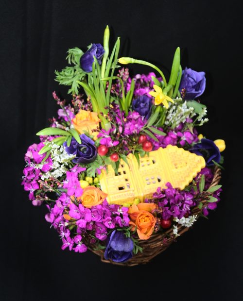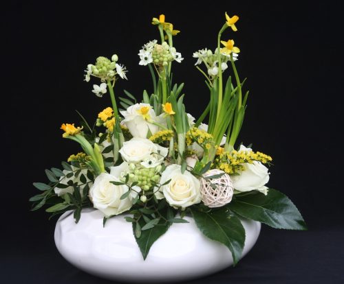Drie hoge Zuidenwindlelies springen in het oog. Ze worden geflankeerd door minstens even grote slanke bloeiende gele narcisjes op bol. De narcisjes verloren hun bruine velletje en tonen hun stralend witte buikjes. Ze staan gegroepeerd per drie. Het getal drie verwijst naar de Drie-Eenheid of naar God. Narcisjes symboliseren de opstanding, want na de lange, donkere winter is dit één van de eerste bloemen die bloeit. Gele Kalanchoë symboliseert ook liefde. Twee grote groene Fatsia japonica-bladeren liggen op de rand van de schaal. Men ziet dit handvormige blad wel als de beschermende handen van God. Groen tot slot is de kleur van de hoop.