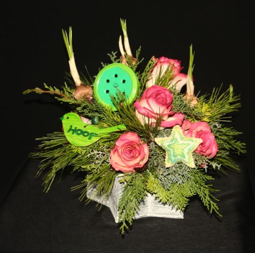Het stervormige zilvergrijze bakje, het houten groen gemaakte vogeltje, de groene (bewerkte) ster, al het kerstgroen plus de bolletjes zijn eveneens een geschenk van Monique.