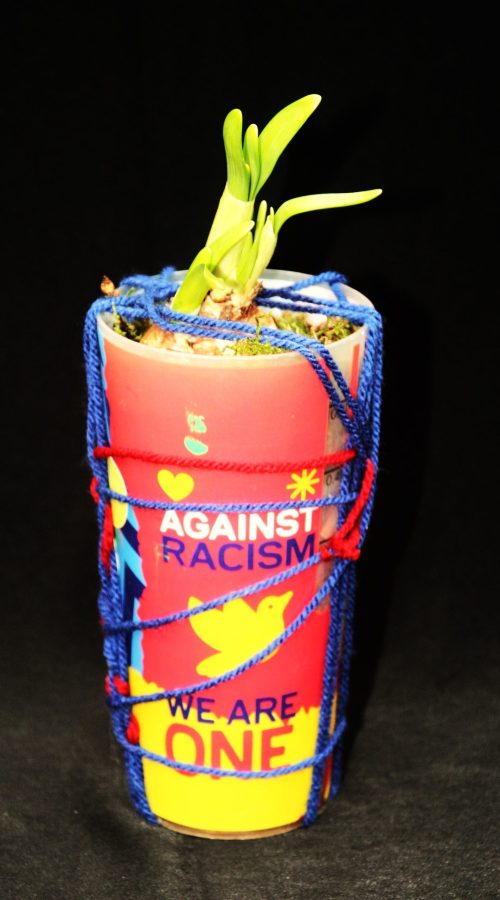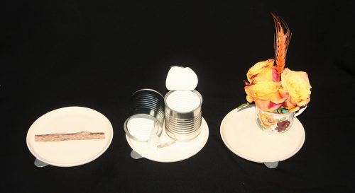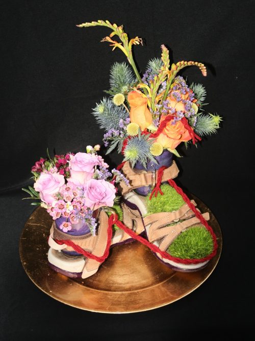De SOEK, de Stichting Oegstgeester Kringloop schonk het paar sandalen! Lidy van der Spek schonk de twee glazen bekers met oor. Het gouden onderbord komt van de Vereniging Kringloop Project Leiden. Het paarse lint en de rode draad komen uit de vazenkast van Monique van der Gaag.