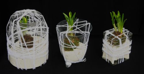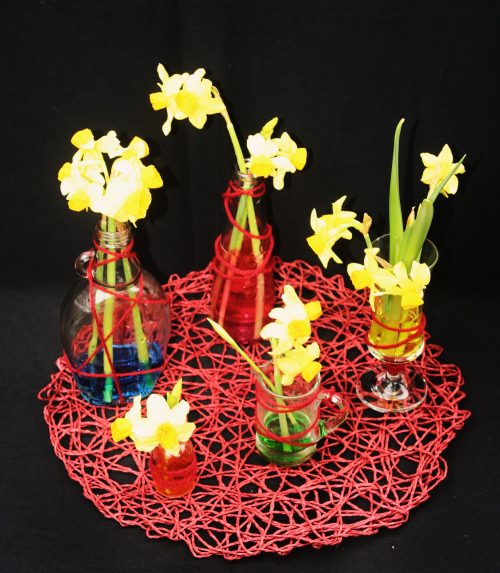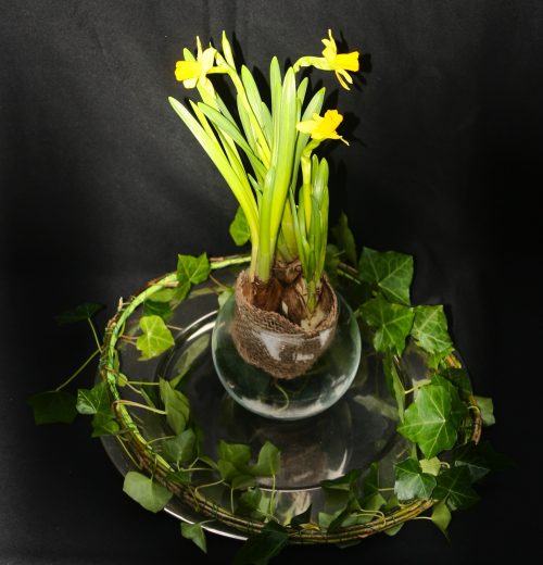 Het ronde glazen bakje is een geschenk van Igna van Dijk. De zilverkleurige schaal en de jute band komen uit de vazenkast van Monique van der Gaag. De klimopranken uit haar ecologische tuin. De drie narcisjes op bol kocht Monique speciaal voor deze gelegenheid en zijn een geschenk.