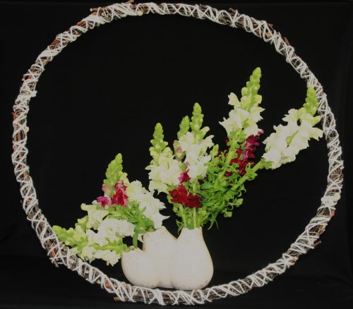 Wit als kleur van licht en feest is de liturgische kleur vanaf Pasen tot Pinksteren. Spreken begint met de eeuwige kringloop van inademen en uitademen. Bij een uitademing komt er geluid: klanken, die woorden kunnen zijn. De krans of cirkel is gemaakt van buigzame wilgentakken met katjes. Wilgentakken maken geluid als de wind er langs strijkt. Dichters zouden zich daardoor laten inspireren. Baby’s Breath of Gypsophila rondom de krans gewikkeld was mooi en passend geweest, maar was niet te koop. De cirkel verwijst naar oneindigheid en is een symbool voor de aanwezigheid van God, die bij Mozes was en bij ons is als we moeten spreken. Een bloem met een mond, die in deze tijd bloeit en de juiste liturgische kleur heeft, is het Leeuwenbekje. Knijpt men namelijk in het bloemhoofd, dan opent de muil vanzelf. Zeven witte Leeuwenbekjes staan in een witte vaas met drie monden. Drie is het getal dat verwijst naar de Drie-Eenheid of naar God. Het getal zeven staat voor de volmaaktheid van God. Drie donkerroze Leeuwenbekjes staan tussen de witte voor het contrast.