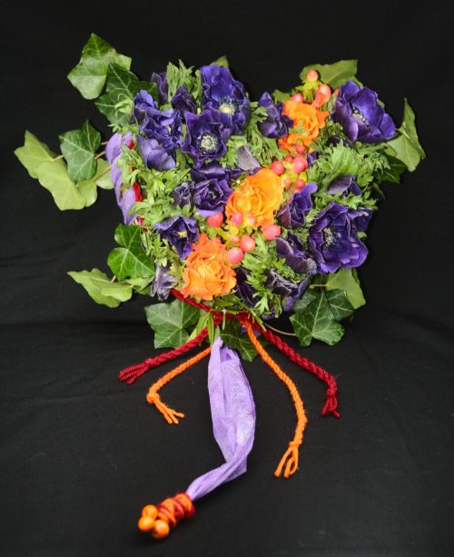 Twee grote handvormige groene bladeren afkomstig van de Vingerplant of Fatsia japonica worden wel gezien als de handen van God. Groen is de kleur van de hoop. Een paarse spijker maakt een gat in het blad, gaat zelfs door twee bladeren heen. Paars is de kleur van verdriet en lijden. Maar in de palm van de hand groeien twee geurende rozen als symbool van liefde (van God): een grote witte Avalanche roos van onschuld en een grote rode, een Red Naomi, gekweekt in Nederland door duurzame en biologische kwekers. Een Dianthus (barbatus) ‘Green Trick’[1] staat er pal naast en is niet alleen een Bloem van God, maar ook een bloem, die vriendschap en liefde symboliseert.