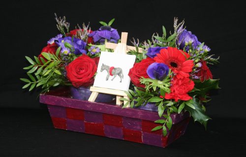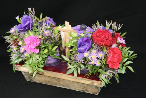Wit als kleur van licht en feest is de liturgische kleur vanaf Pasen tot Pinksteren. Witte rozen vertegenwoordigen zowel liefde als onschuld en wit is ook de kleur van de vrede: denk aan het zwaaien met een witte vlag. De bloedrode Pioenroos symboliseert liefde. De Blauwe Disteltjes staan voor verdriet, pijn en lijden. De witte bloempjes van de Delphinium betekenen positiviteit. Het aantal van drie Pioenrozen verwijst naar de Drie-Eenheid of naar God.