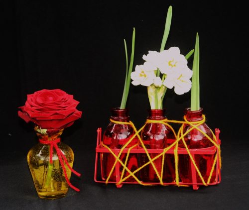 Het zat een beetje tegen, want… geen enkele bloem kan tegen temperaturen onder nul. Het kristalheldere water, het roze gekleurde of het rode bloemenwater bevriest zelfs. Dat zou wel een mooie metamorfose zijn! Maar het glas breekt. En al brengen scherven geluk, men moet de goden niet verzoeken. Of God om een wonder vragen?