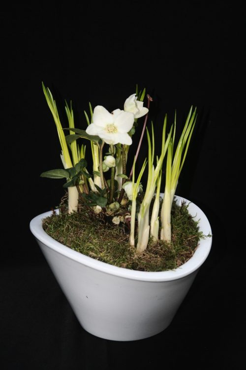 Na Kerst(mis) blijft de liturgische kleur wit tot Driekoningen op 6 januari. Wit is de kleur van licht en feest. Groen is de kleur van de hoop: het blad van de Helleborus of Kerstroos is groen, mos is groen, de Klavertjes 4 zijn groen en uit de aarde komen wit met groene puntjes van bolletjes in drietallen tevoorschijn. Misschien wel als een paarse Krokus? In ieder geval als teken van hoop. Ook de witte bloemen van de Helleborus symboliseren hoop: het is een wonder dat deze plant vanaf Kerstmis de hele winter bloeit. In de witte sierpot staan drie verschillende soorten: Helleborus, Krokus en Klavertje 4. Drie is het getal van de Drie-Eenheid of van God. De vier blaadjes van het Klavertje 4 staan voor hoop, liefde, vertrouwen en geluk.